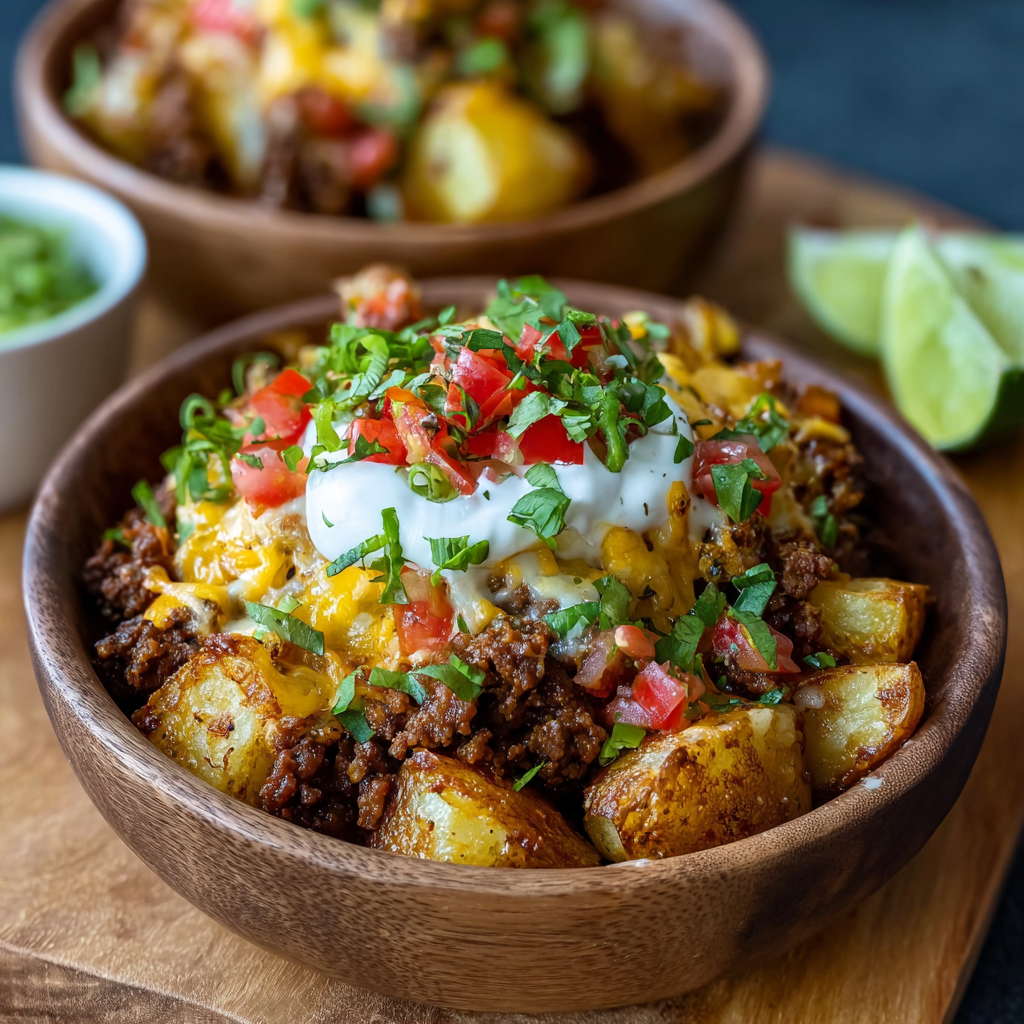Loaded Potato Taco Bowls combine crispy potatoes, seasoned filling, melty cheese, and fresh toppings for a family-friendly, crave-worthy meal. Quick, customizable, and fun to serve, they’re perfect for weeknights or gatherings.